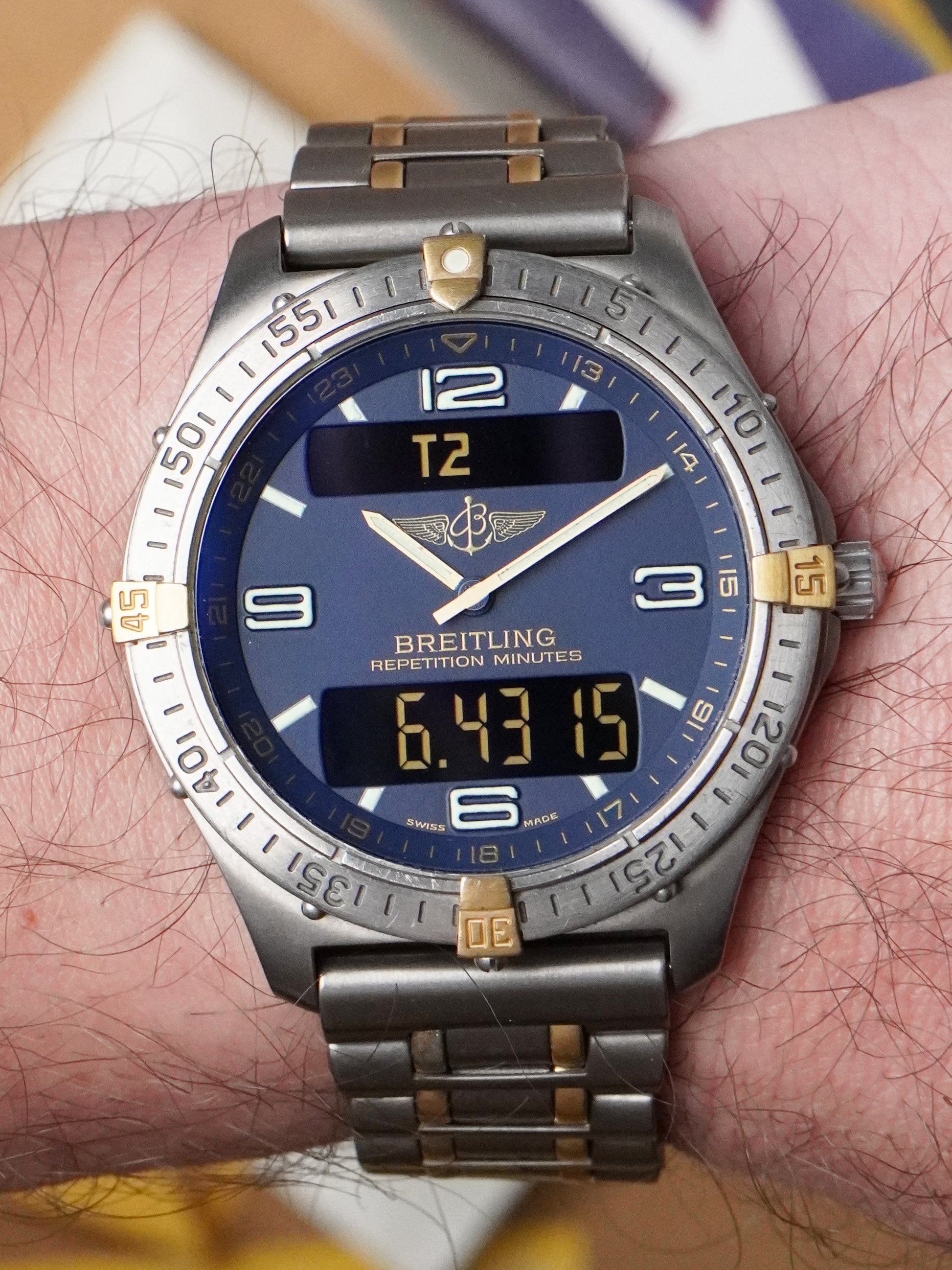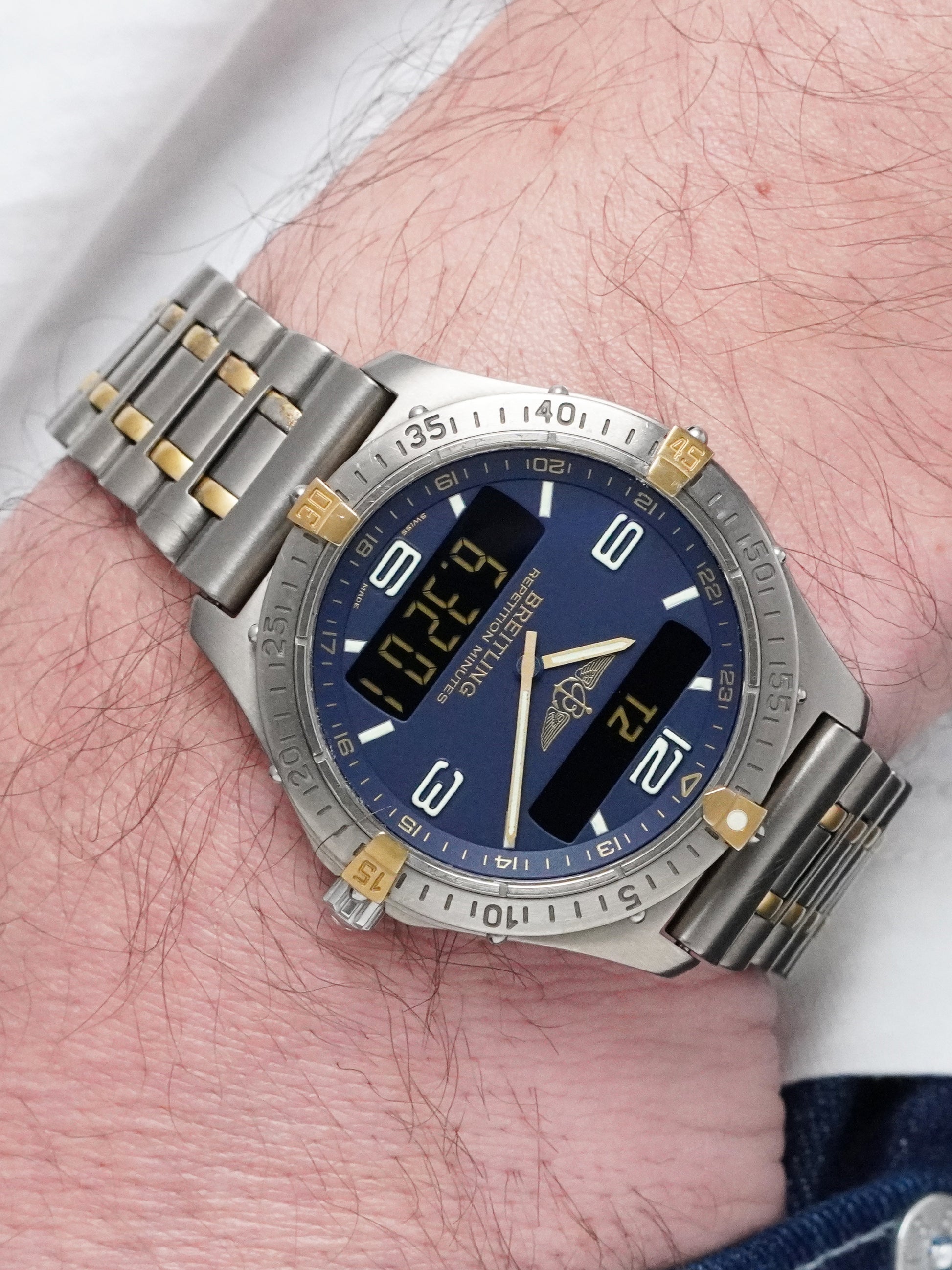 A rare and highly desirable two-tone Breitling Aerospace F65062, combining lightweight titanium with elegant 18k yellow-gold accents, offered here in very good condition and as a complete full set. This is one of the most sought-after configurations of the early Aerospace line — a model celebrated for its multifunction ana-digi display, ultra-thin profile, and professional pilot-watch heritage.
