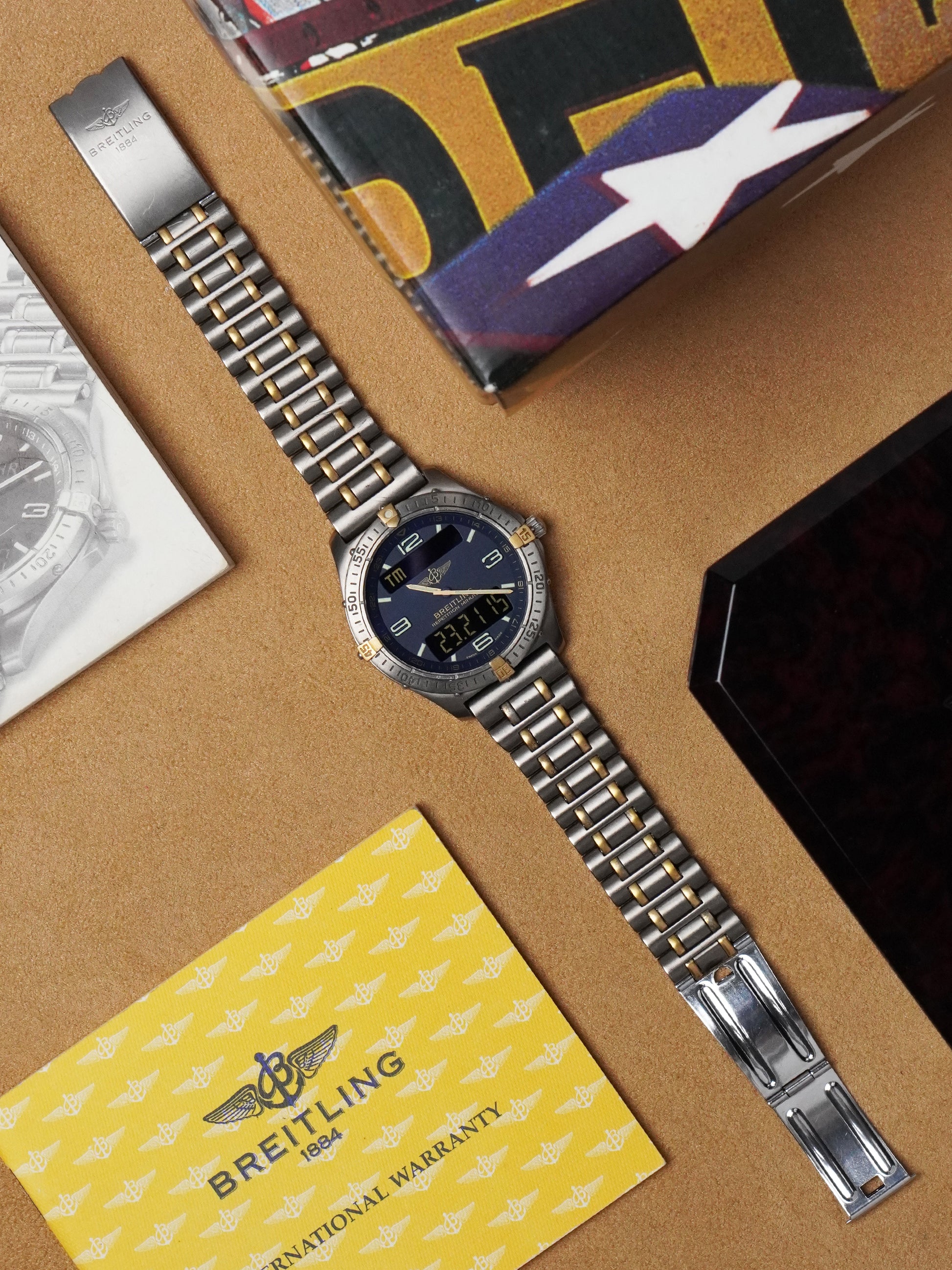 This example comes with its Original Breitling Outer Box, Presentation Box, Document Holder, Aerospace Manual Book, and the International Warranty Certificate — a complete and beautifully preserved set rarely seen today. The titanium and gold bracelet is in very good condition and is suitable for a 20 cm wrist, extending up to 22 cm thanks to the integrated extension in the buckle.