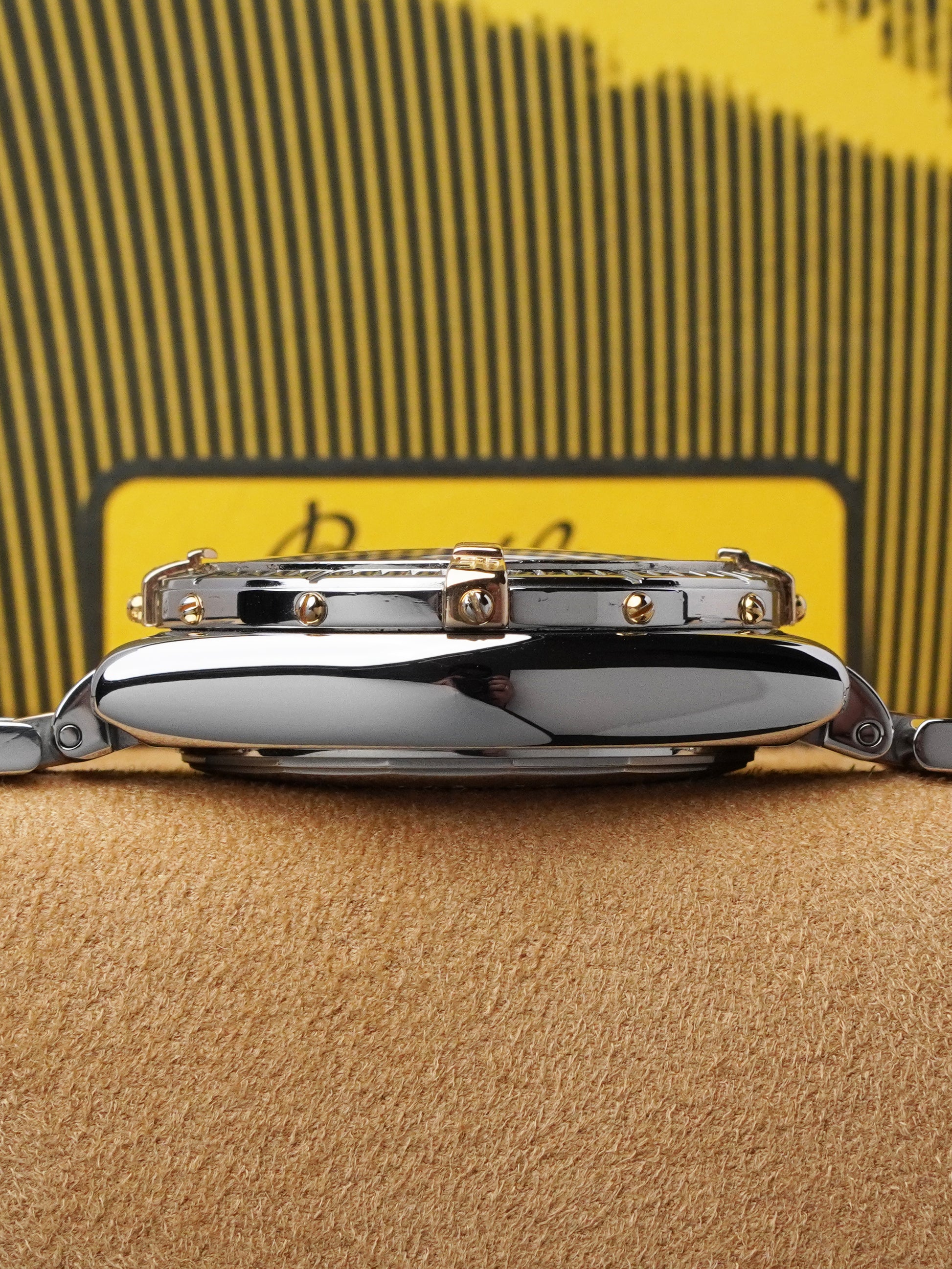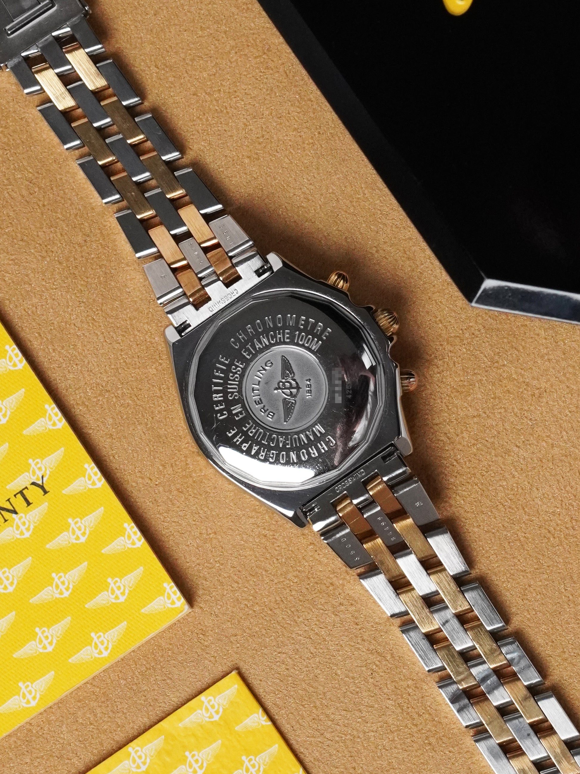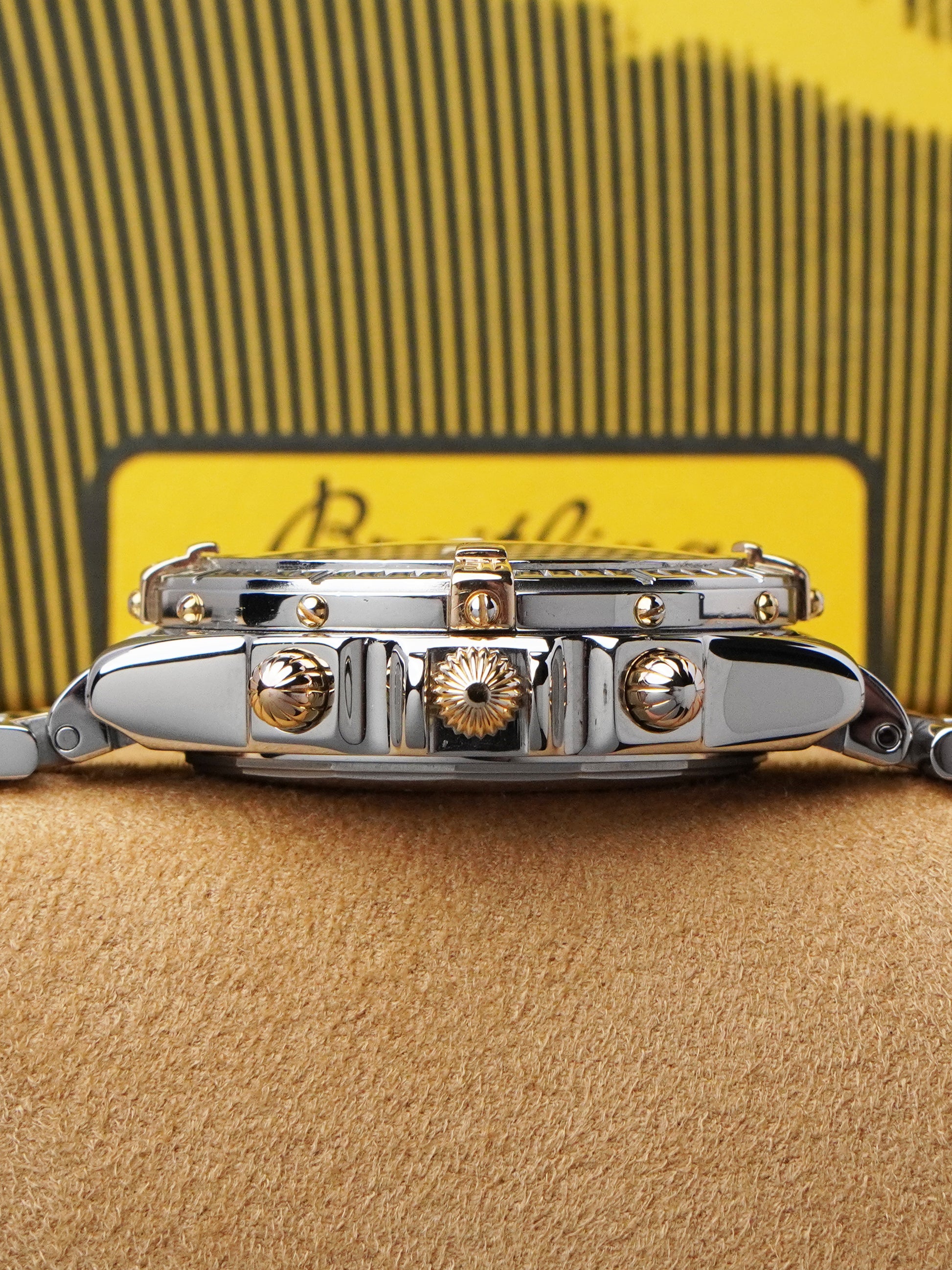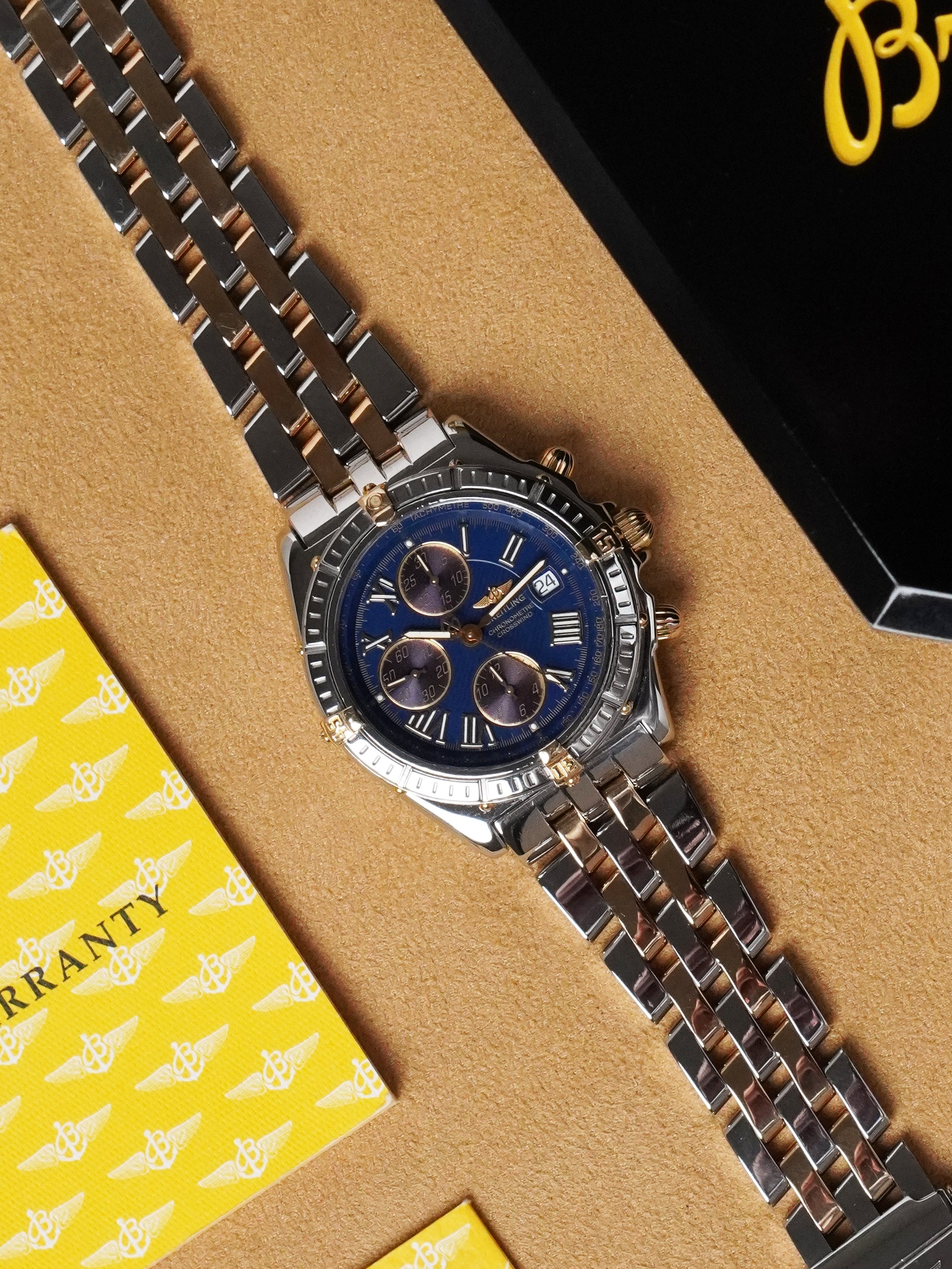 This one-owner example is offered in excellent condition and has been fully serviced on 23.12.2025 by our in-house certified watchmaker, ensuring flawless operation of the automatic Breitling Caliber 13 (Valjoux 7750 base). The striking blue dial is paired with a two-tone steel and 18k yellow-gold bracelet, complemented by gold rider tabs, gold crown, and gold chronograph pushers—a beautifully balanced, unmistakably Breitling look. The bracelet is complete and suitable for a 21 cm wrist.
