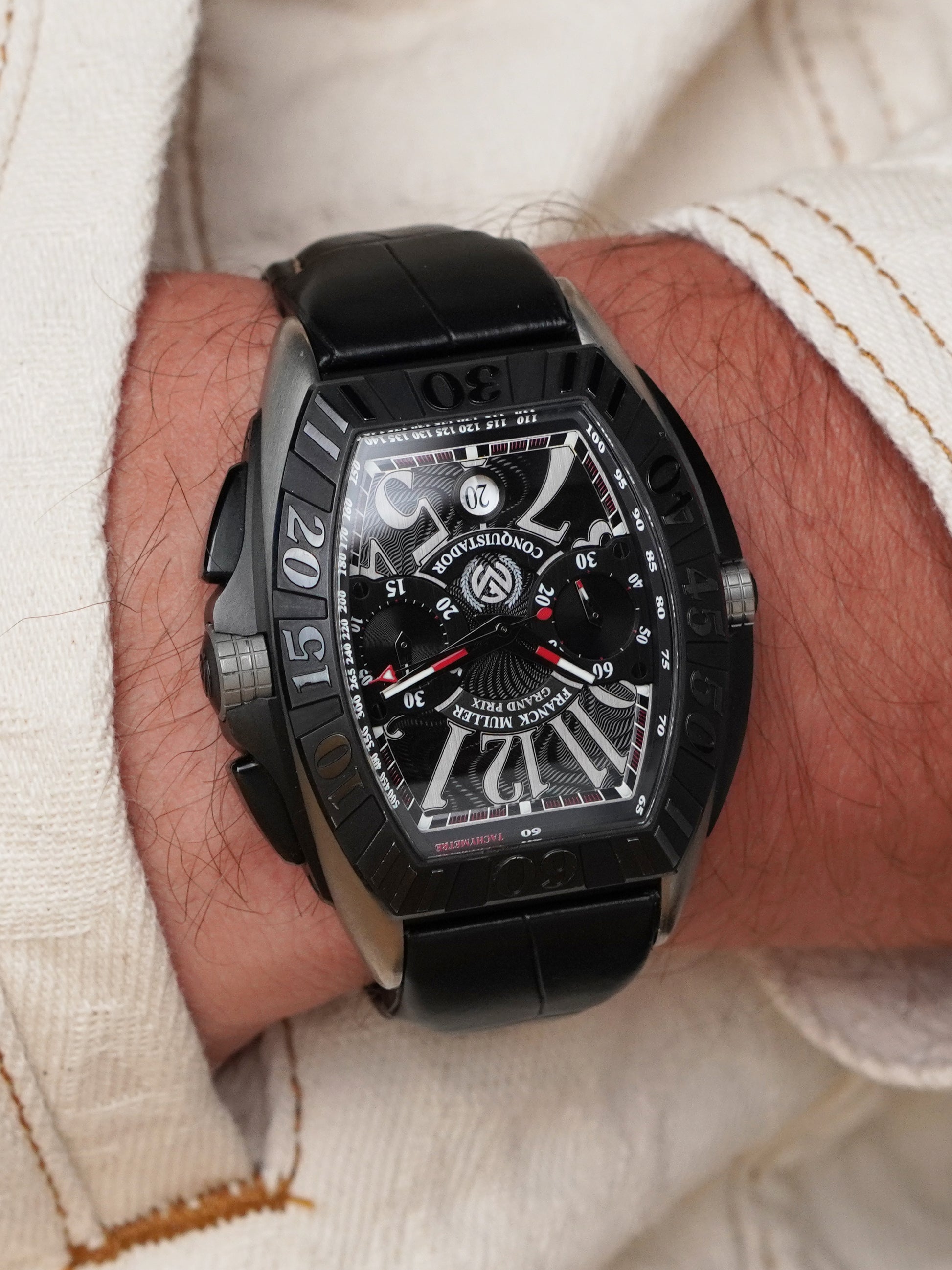 The Franck Muller Conquistador Grand Prix Chronograph Ref. 8900CCJ TT is a bold statement in luxury sports watchmaking, inspired by the precision and adrenaline of high-speed racing. Its distinctive tonneau-shaped case is crafted from lightweight and durable titanium, giving it a commanding presence on the wrist while ensuring all-day comfort. The striking dial is adorned with oversized applied Arabic numerals, a guilloché texture, and a tachymeter-style flange, perfectly balancing elegance with sportiness.