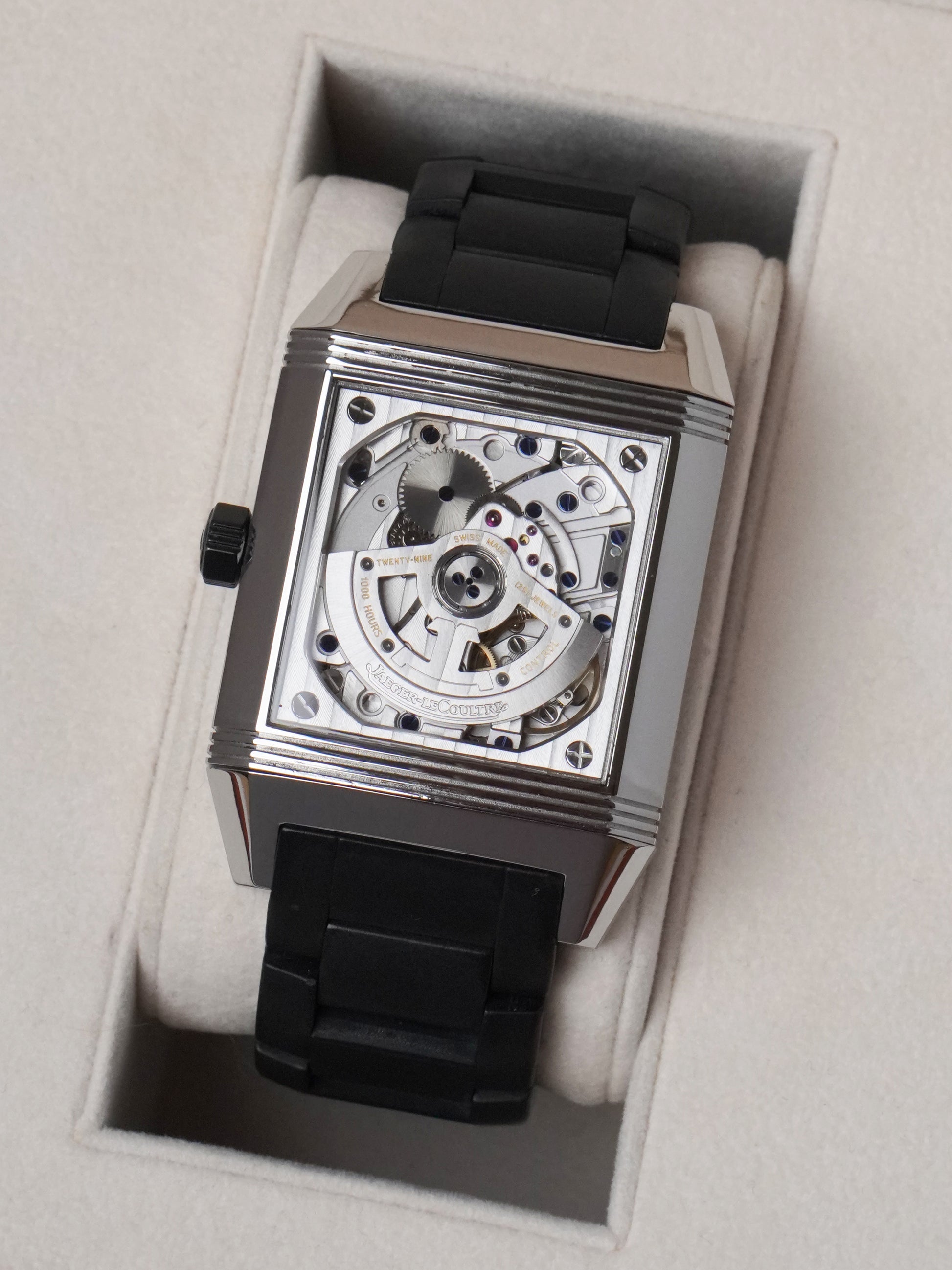 The Jaeger-LeCoultre Reverso Squadra Hometime Ref. 230.8.77 / Q700867P is a bold reinterpretation of a timeless icon. Introduced in 2006, the Squadra line—named after the Italian word for “team”—was designed to offer a more robust, contemporary feel while preserving the elegance and ingenuity of the classic Reverso. The 35mm x 50mm stainless steel case with its strong, square profile makes a confident statement, while the reversible design retains the original Reverso’s dual-identity spirit.
