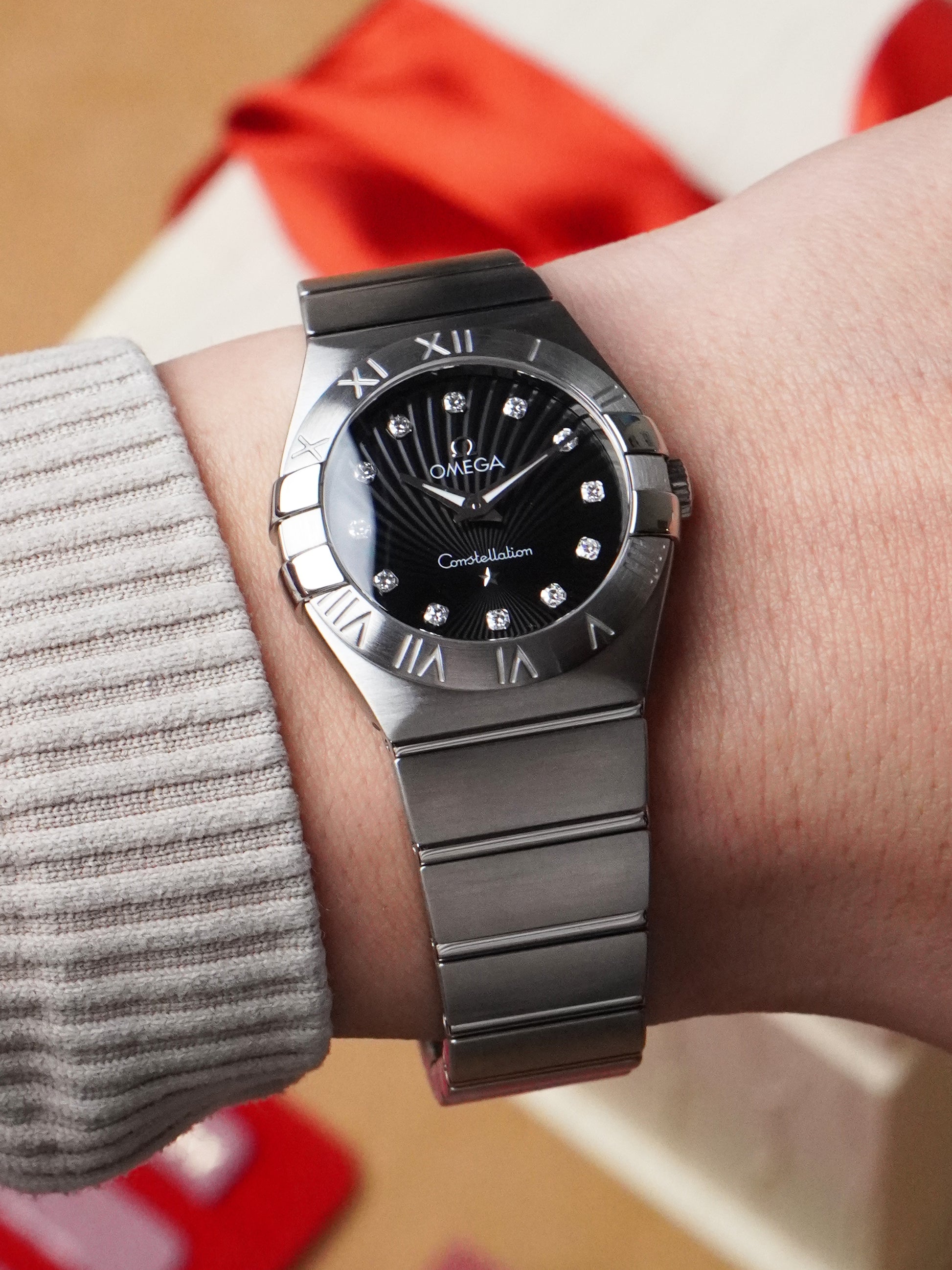 This 27mm stainless steel model features the signature Constellation “claws”, an integrated bracelet, and a striking black “Supernova” dial adorned with polished dauphine hands and gem-set hour markers. The watch is powered by Omega’s reliable Caliber 1376 quartz movement, offering exceptional accuracy and low maintenance — ideal for everyday wear or refined occasions.