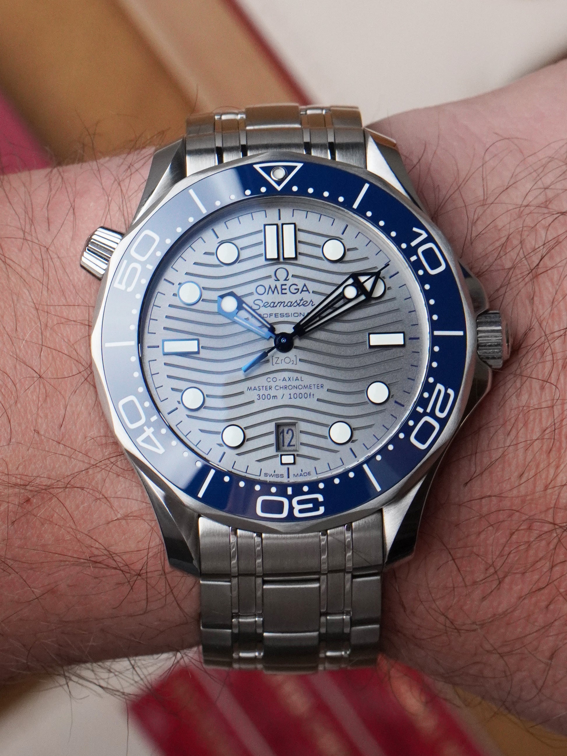 The sun-brushed PVD chrome-coloured ceramic dial features laser-engraved waves, a date window at 6 o’clock, and blued skeleton hands and applied indexes filled with white Super-LumiNova. Surrounding the dial is a striking blue ceramic bezel insert with a white enamel diving scale — a signature element of the modern Seamaster line.