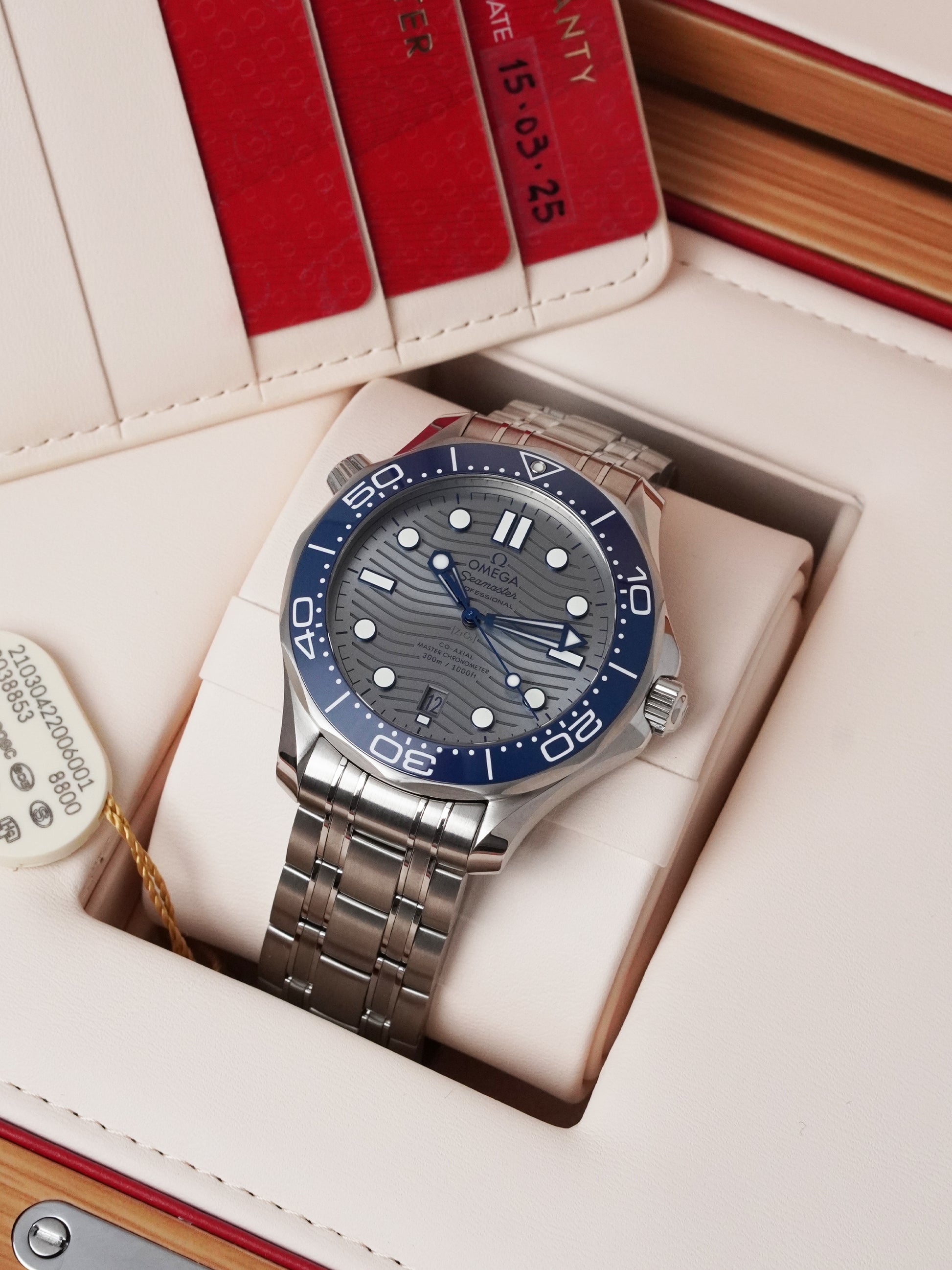 This watch is in like-new condition and comes as a complete full set, including the Omega outer box, presentation box, Omega travel box, card holder, International Warranty Card dated 15 March 2025, Master Chronometer card, Pictograms card, operating manual, and Omega tag with watch data. The watch remains under official Omega warranty until March 2030.