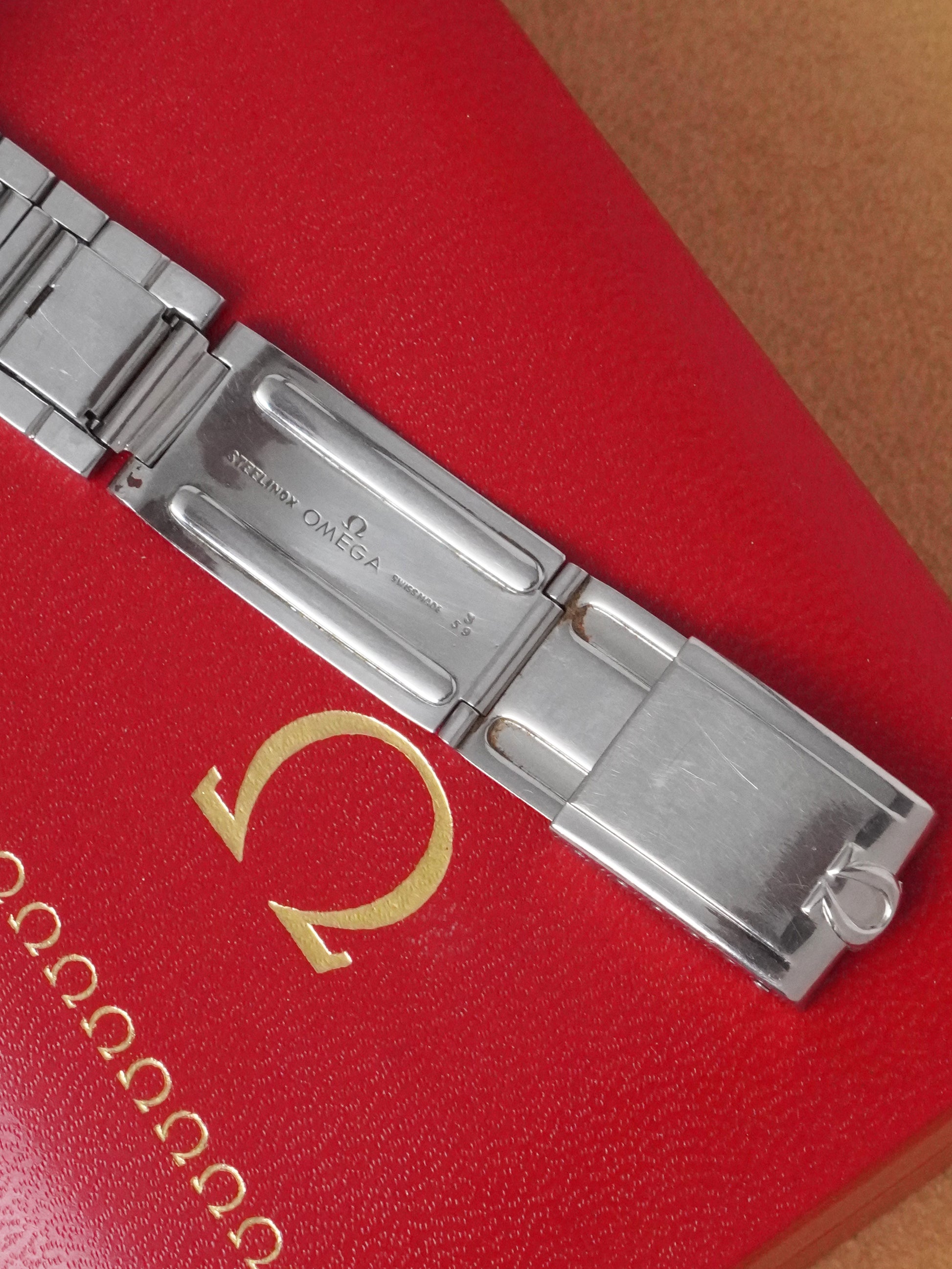 The watch is fitted with its original Omega 7077 flat-link bracelet, dated 1958, complete with the first-generation short buckle and rare double-spring links. The springs have been carefully replaced using genuine Omega parts. The bracelet fits wrists up to 19 cm.