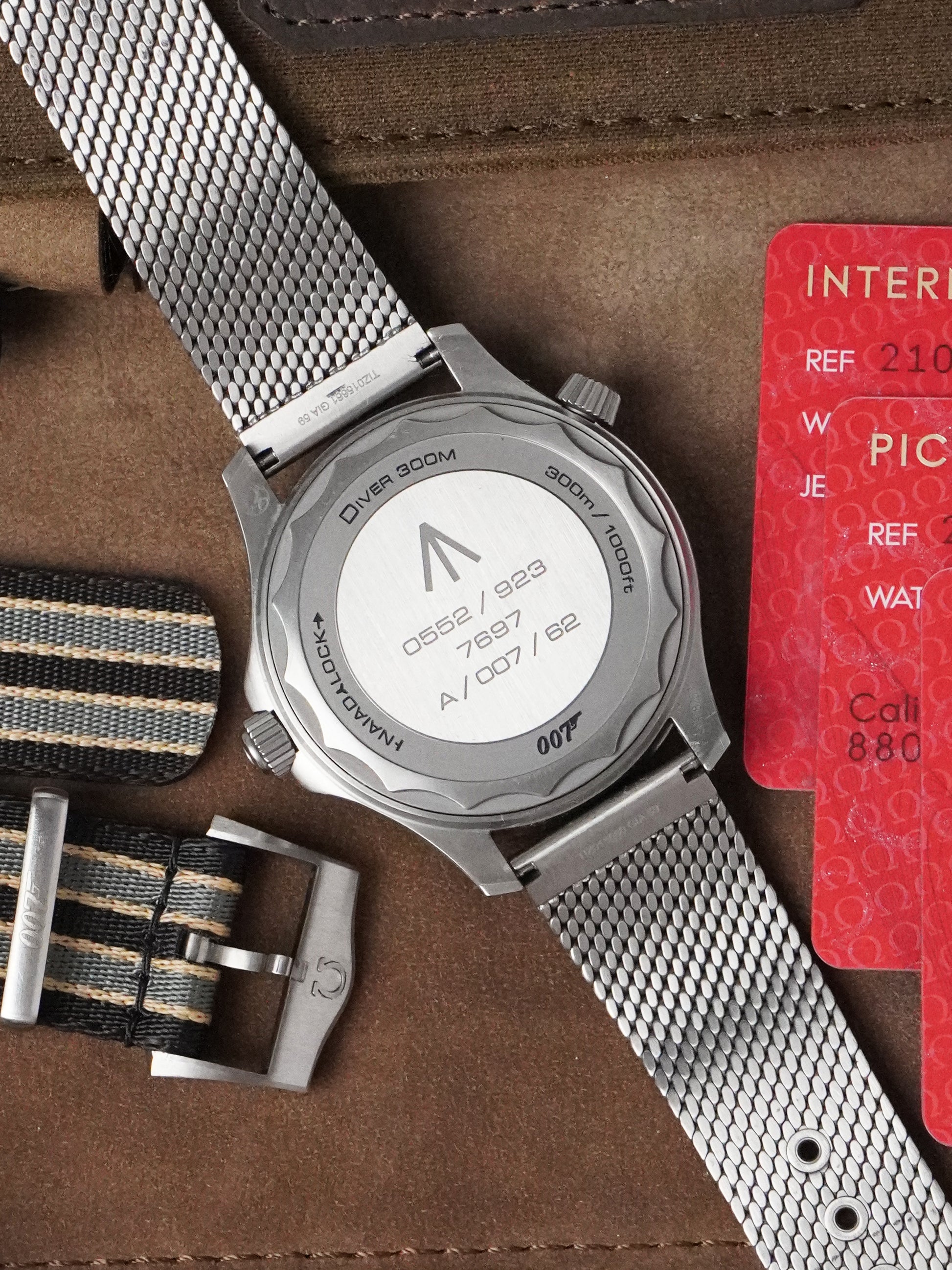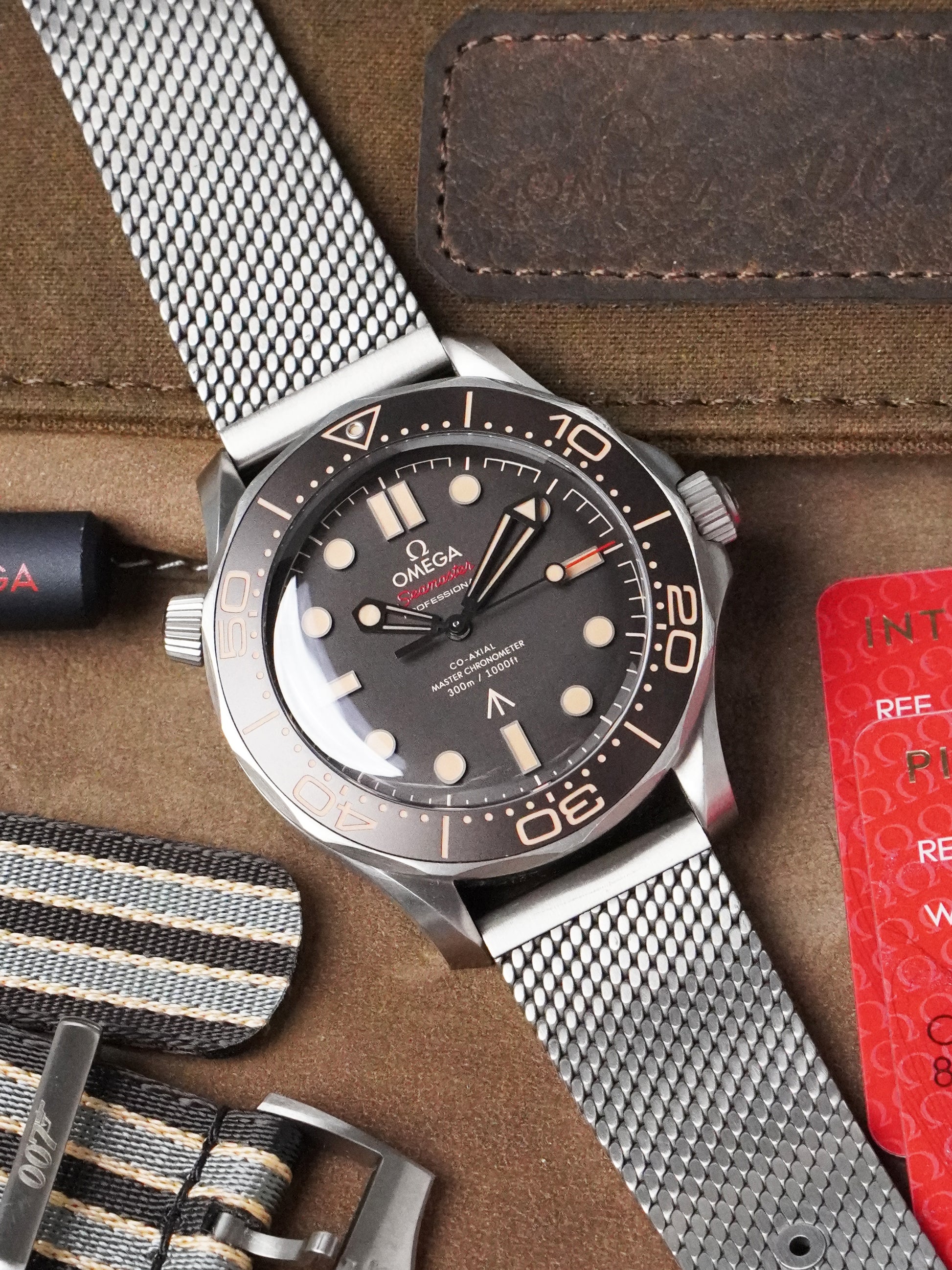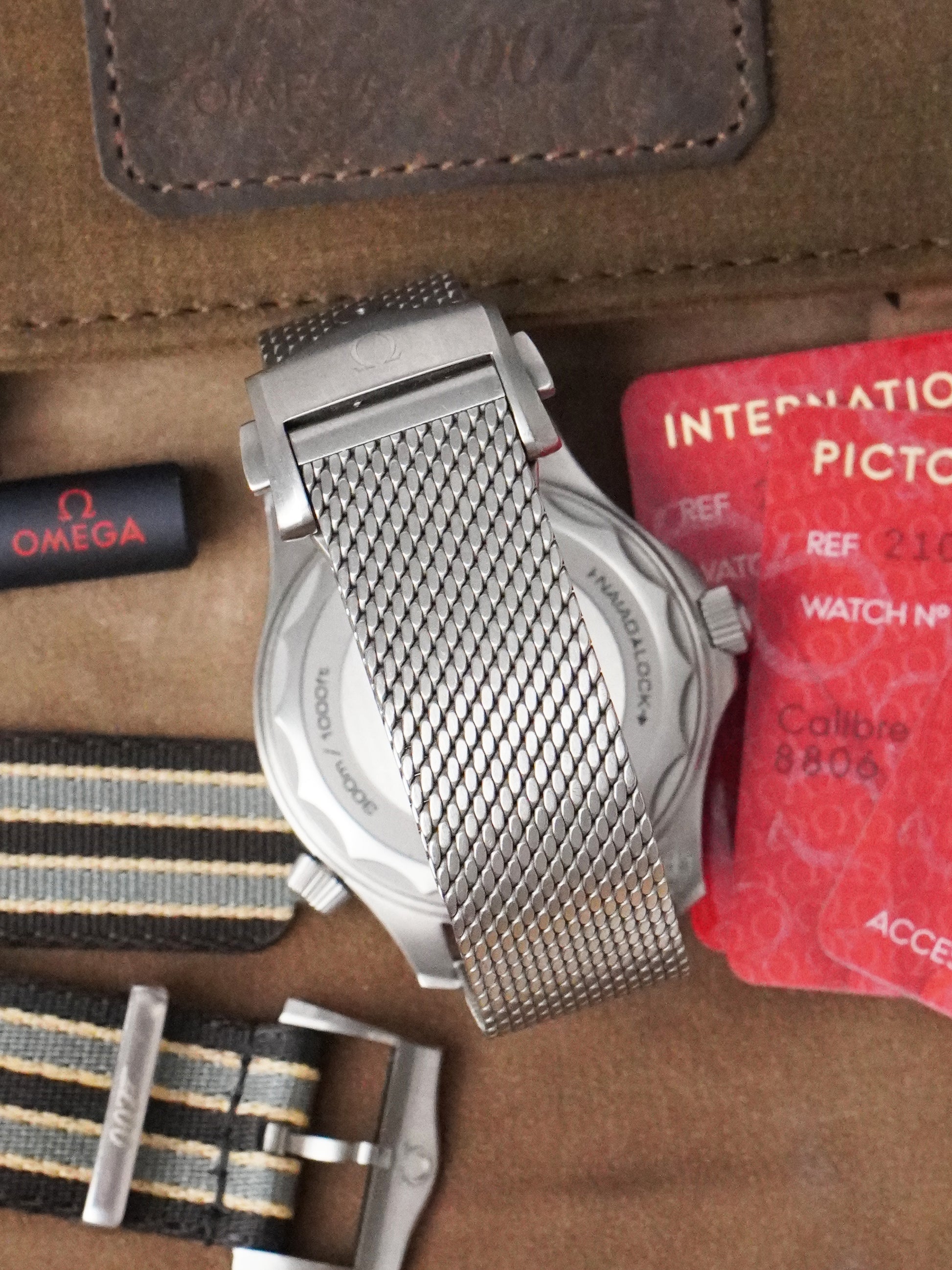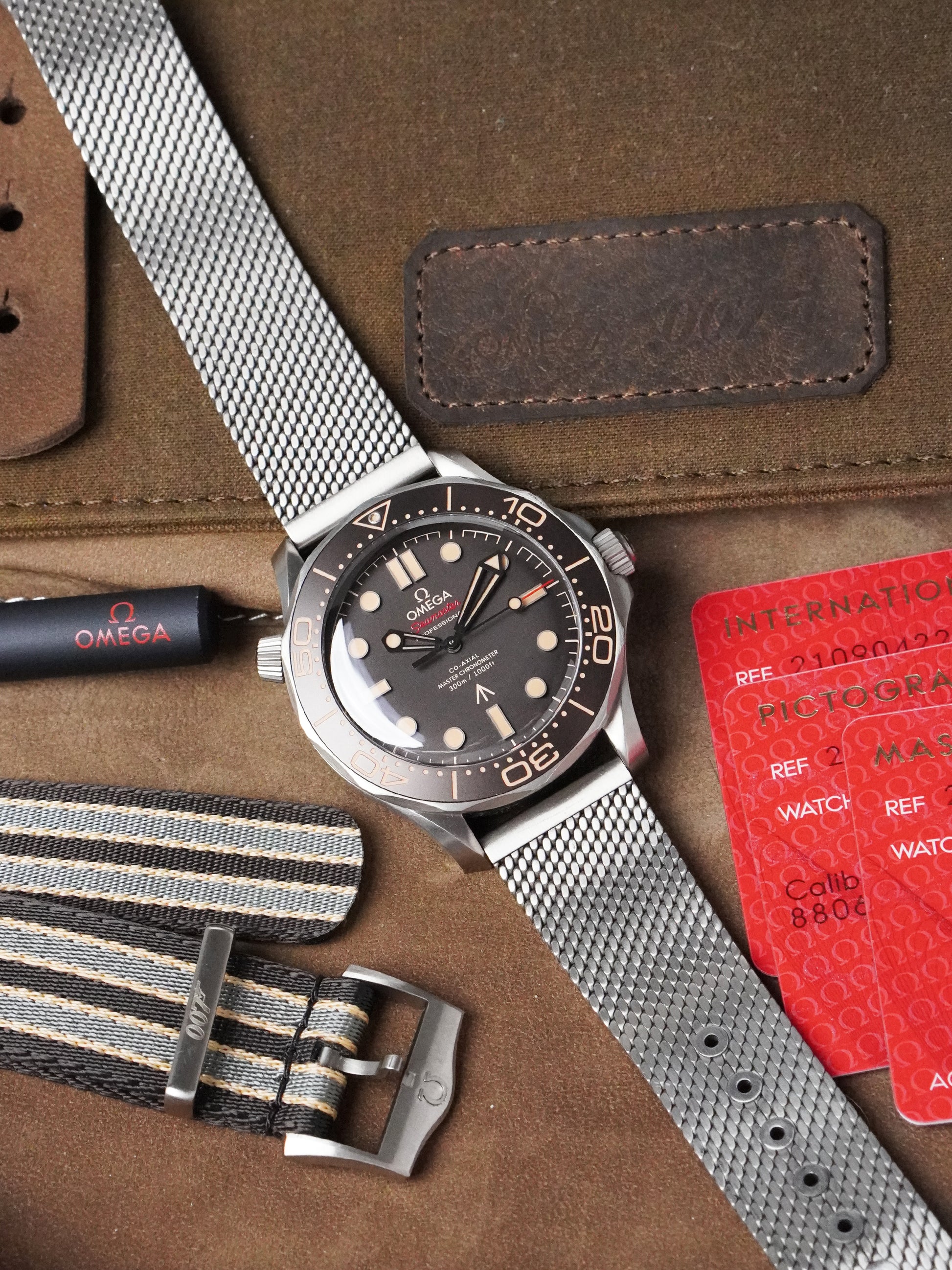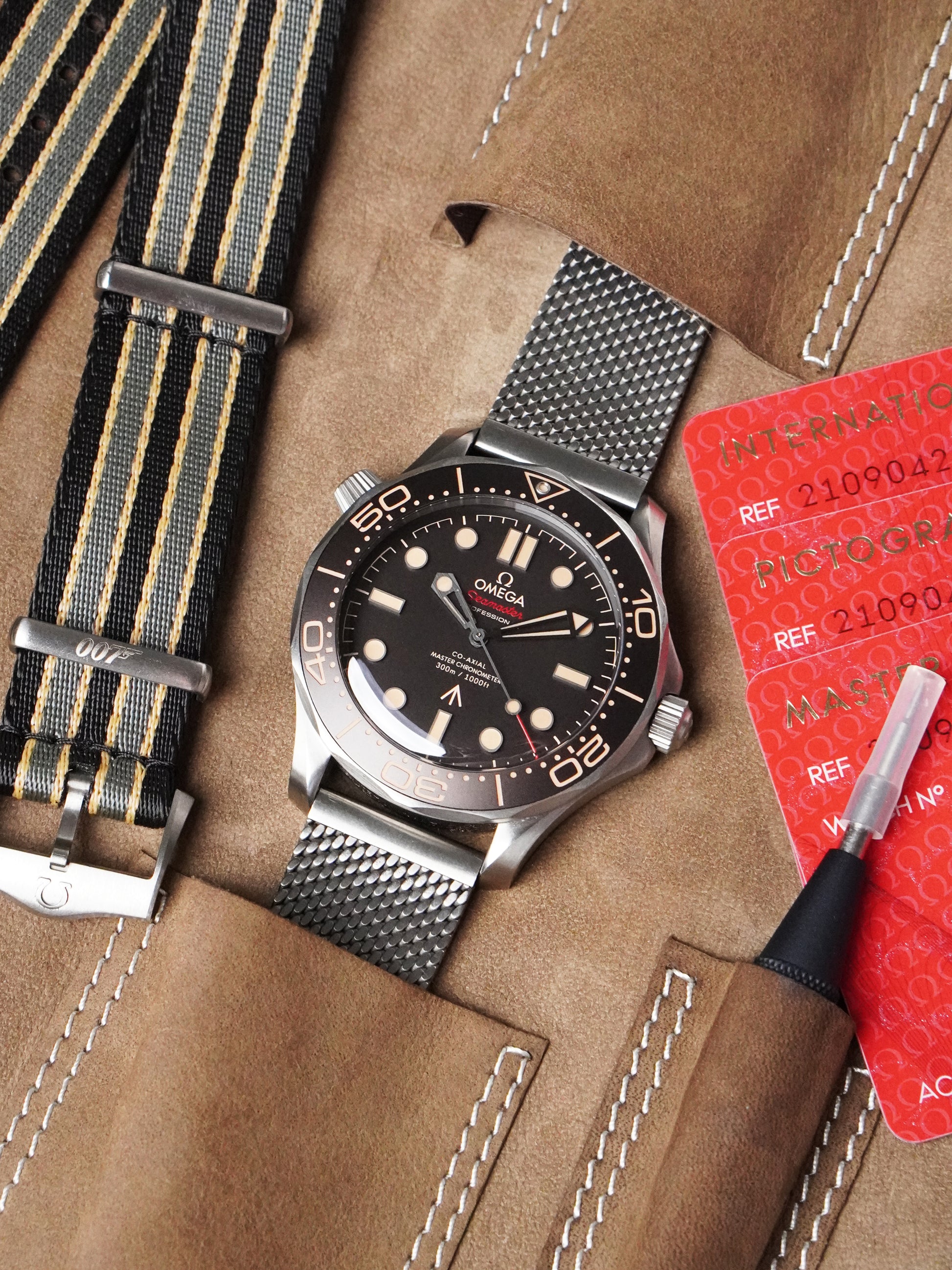 This example is in very good condition, recently checked by our in-house Omega certified watchmaker in August 2025, and has successfully passed water-resistance testing. The watch is still covered by its official Omega international warranty until September 2026, providing extra peace of mind to its next owner. It comes as a full set, including the original outer box, leather travel bag, manual, strap-changing tool, original Omega 007 NATO strap (in very good condition), and the titanium mesh bracelet (fits up to 20 cm wrist). The NATO strap is suitable for wrists up to 21 cm. Documentation includes the original purchase receipt from Omega AD in Finland dated the same day as the cards, the International Warranty Card dated 23.09.2021, Master Chronometer card, and Pictograms card.