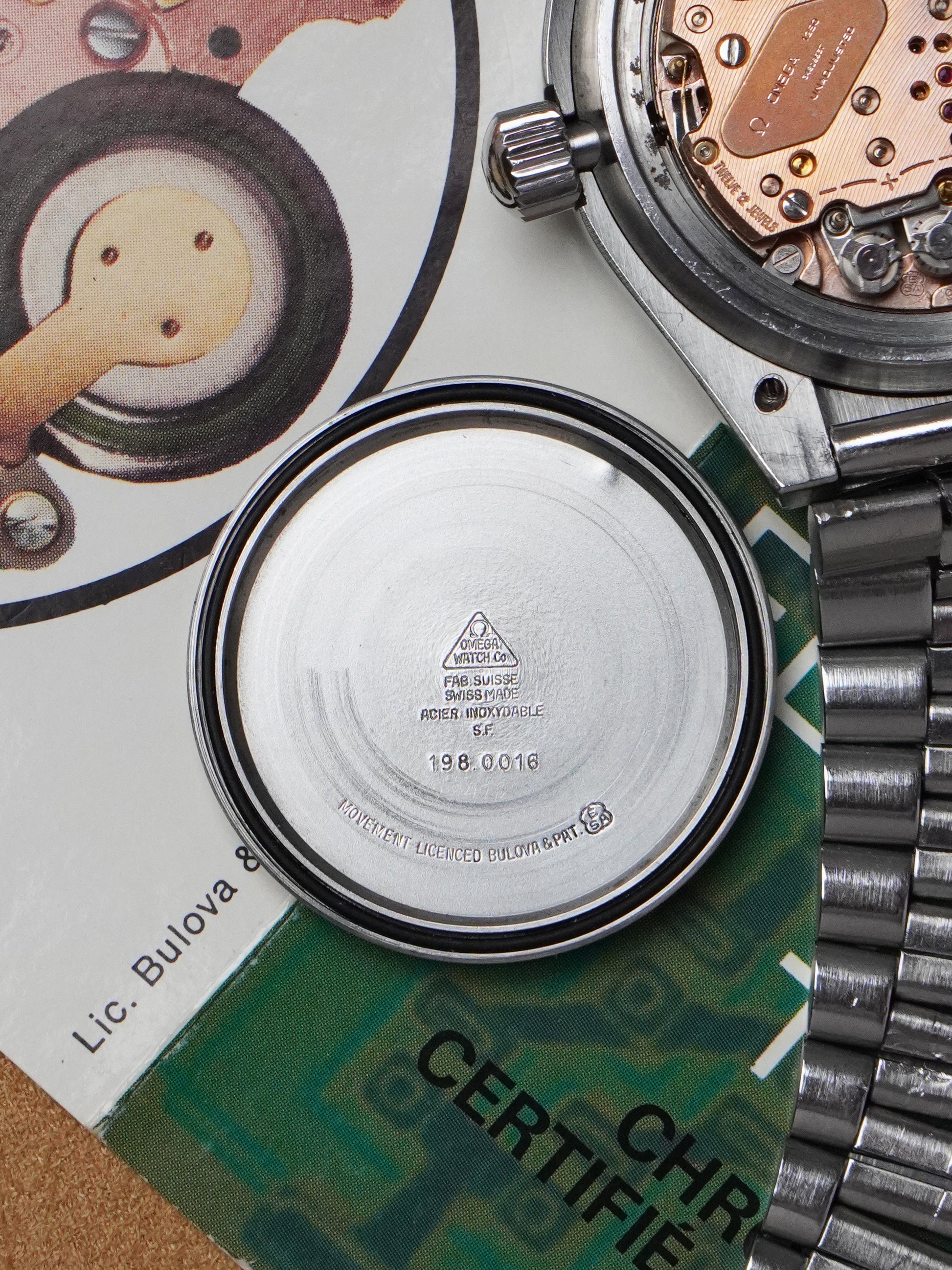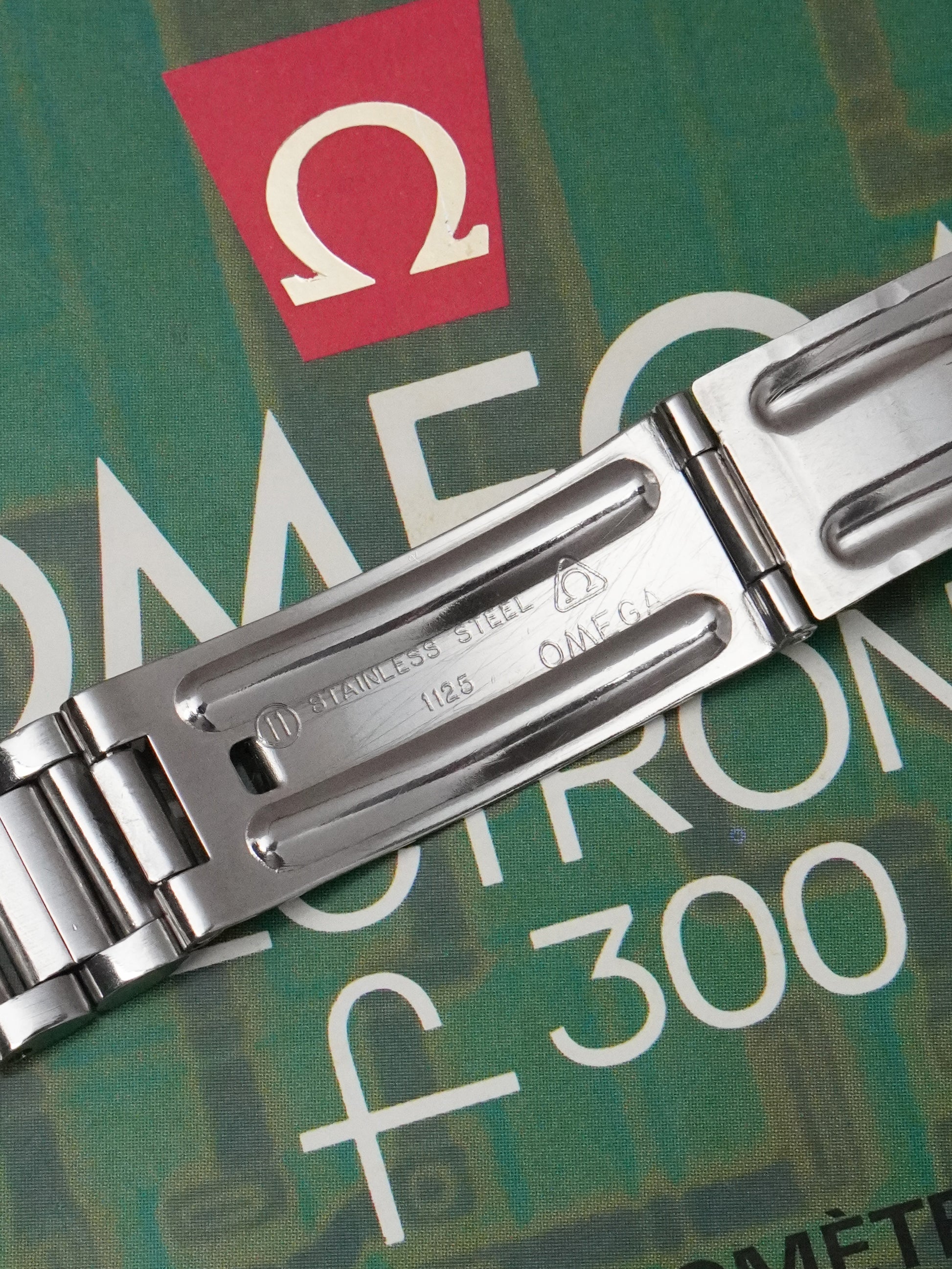 The watch comes with its original Omega box with Electronic f300 label and the “Omega f300 Chronomètre Certifié Officiellement” booklet. It is fitted with the original Omega bracelet ref. 1125, suitable for wrists up to 20 cm. Importantly, this reference does not feature an integrated bracelet, allowing versatile wear on leather or alternative straps—one of the reasons it is particularly valued.