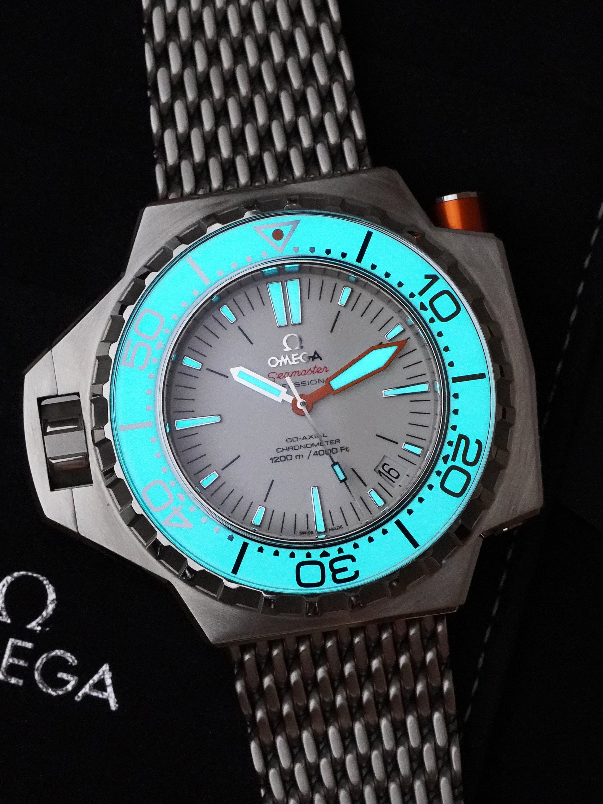 This example is in very good condition and comes as a complete set with its original outer box, presentation box, watch manual, strap manual, card holder, Omega tag, Omega strap removal tool, metal bracelet receipt from Omega AD, Omega waterproof test results, Pictograms card, and International Warranty Card dated 10.03.2020. Rarely are Ploprofs offered with such a comprehensive package.