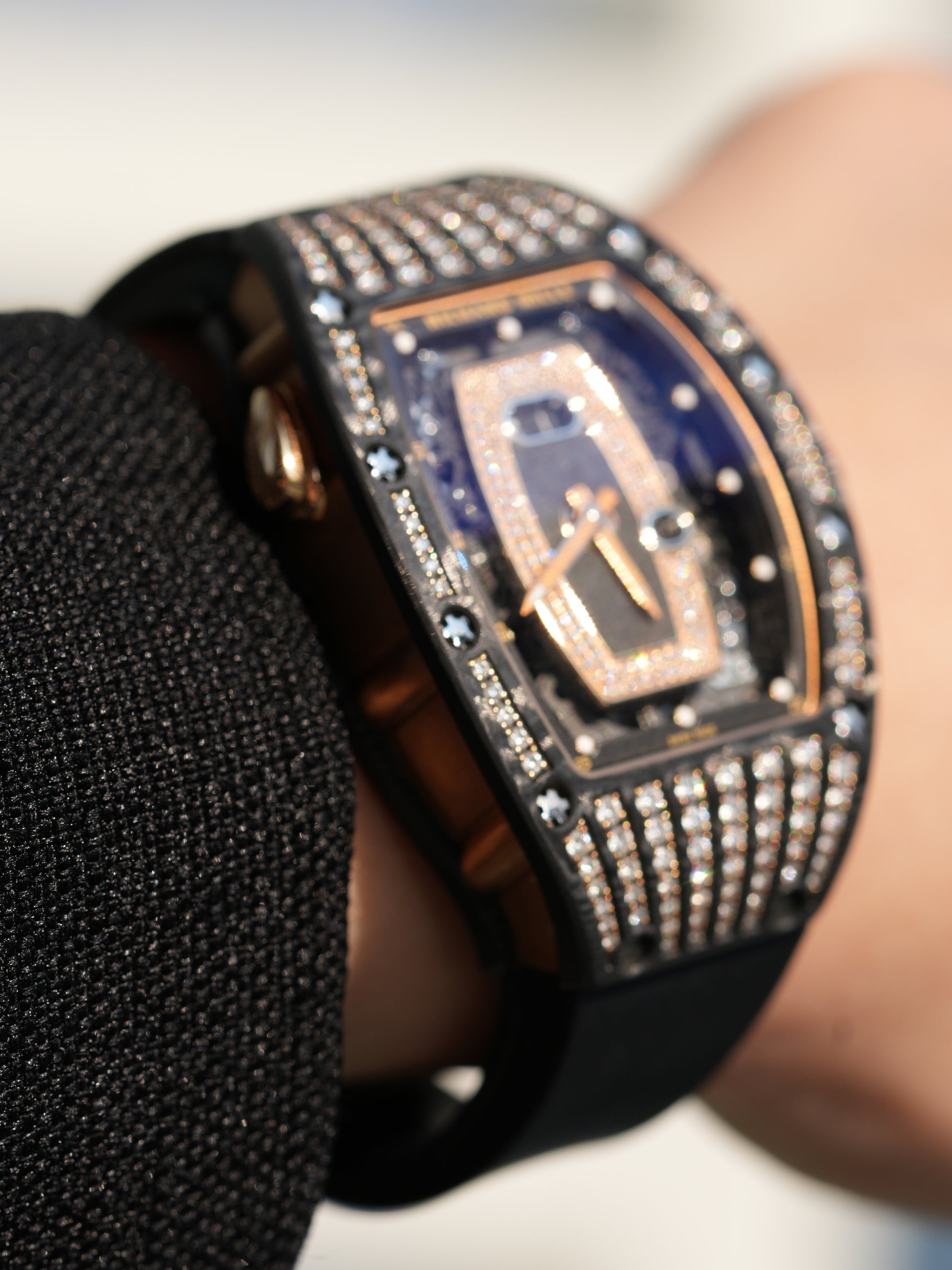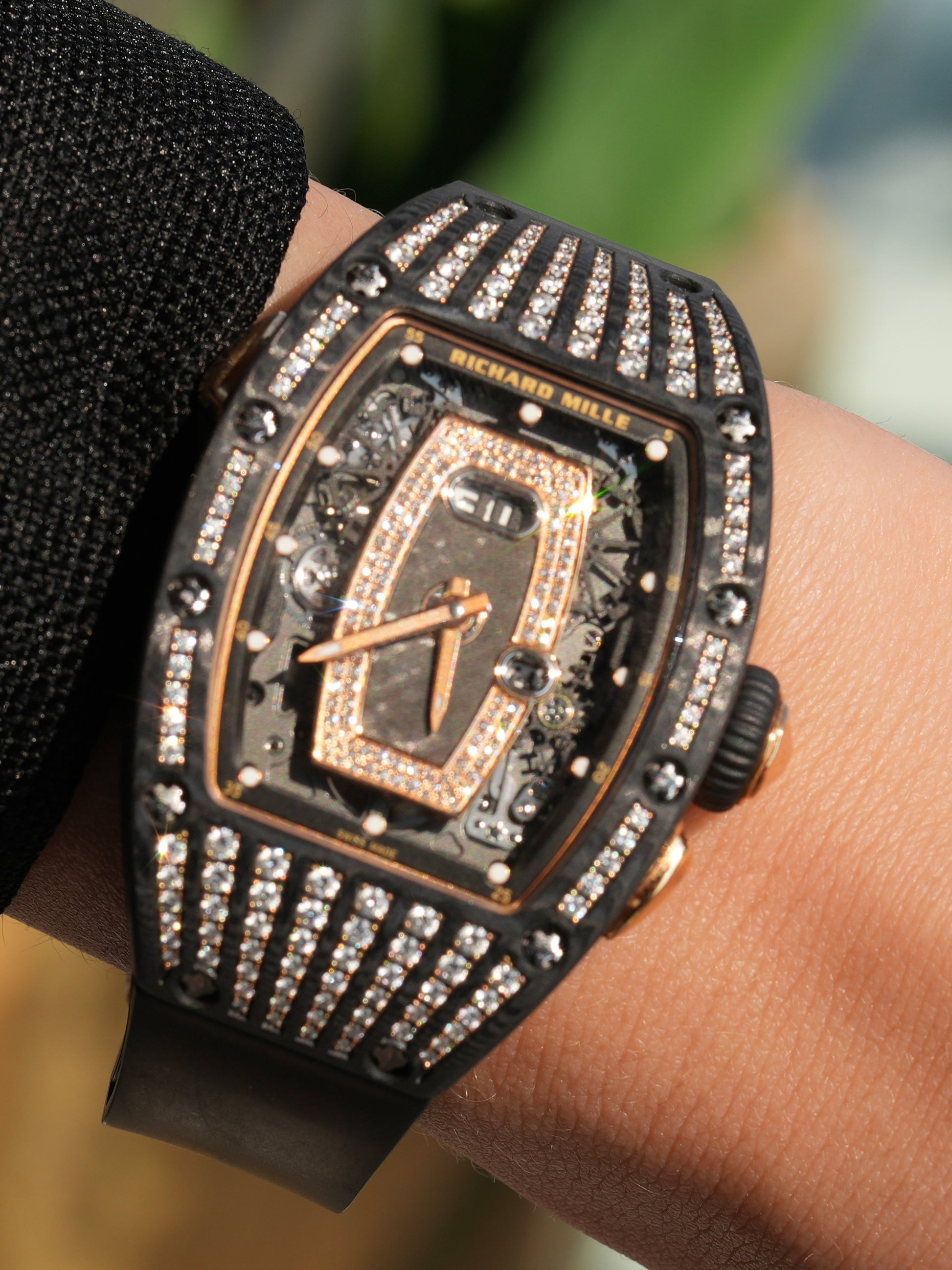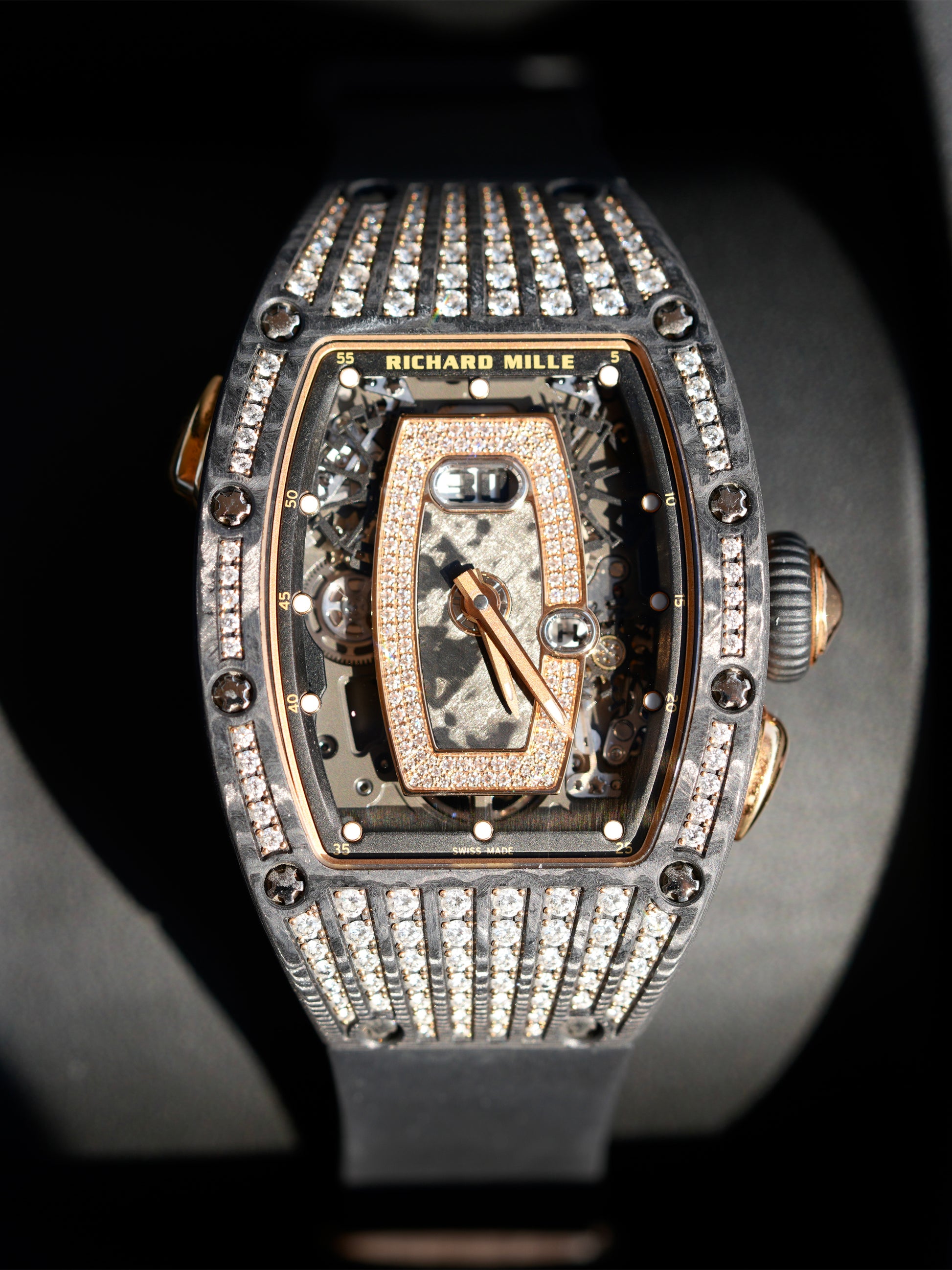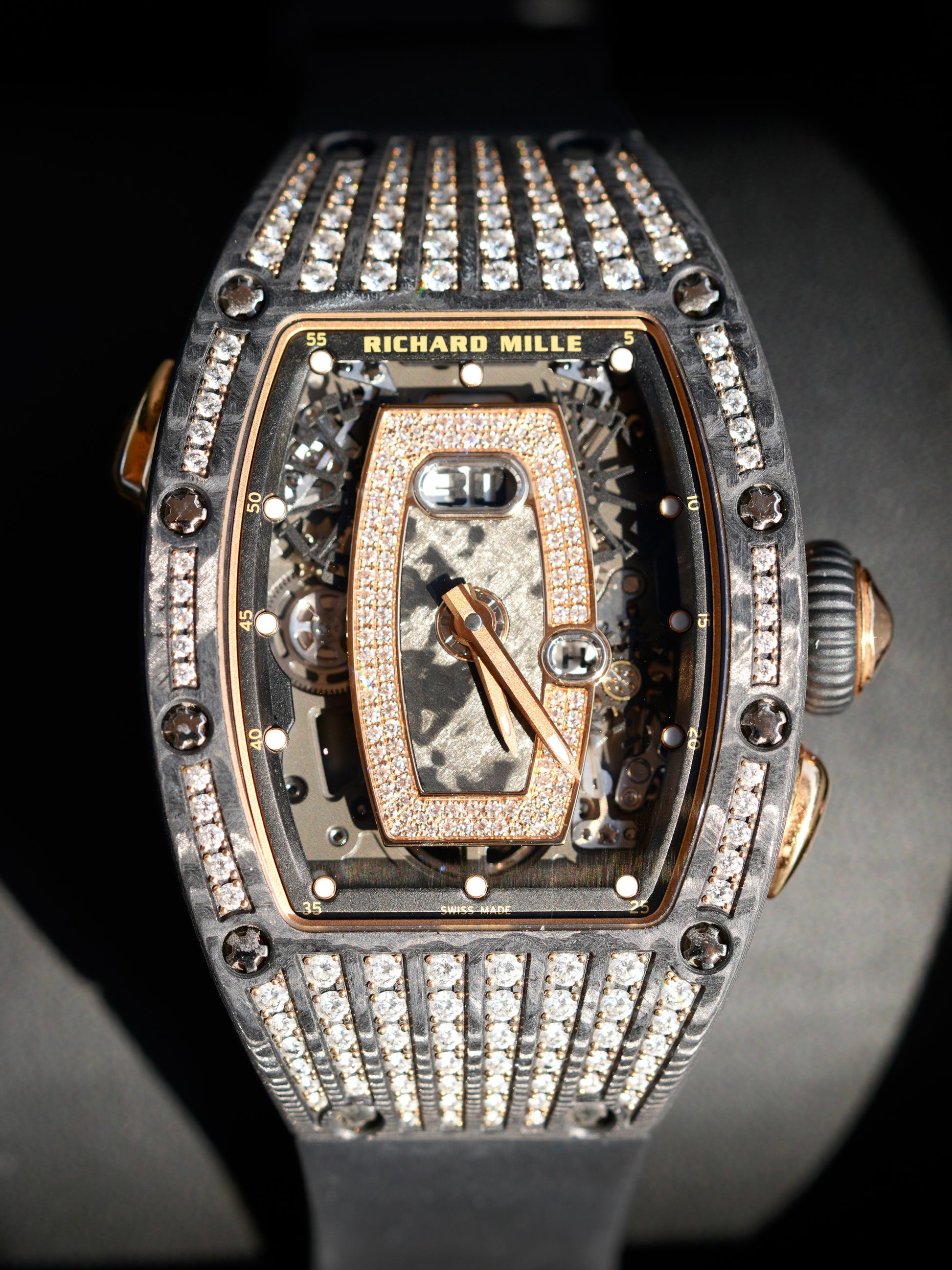 The tonneau-shaped case combines 18k rose gold with Carbon TPT, a proprietary high-tech composite renowned for its lightness, strength, and distinctive layered appearance. A diamond-set bezel adds a luxurious sparkle while preserving the watch’s unmistakably sporty DNA. The fully skeletonized dial showcases the in-house automatic Caliber CRMA1, offering hours, minutes, an oversized date, and Richard Mille’s signature function selector, allowing effortless switching between winding, date, and time-setting modes.