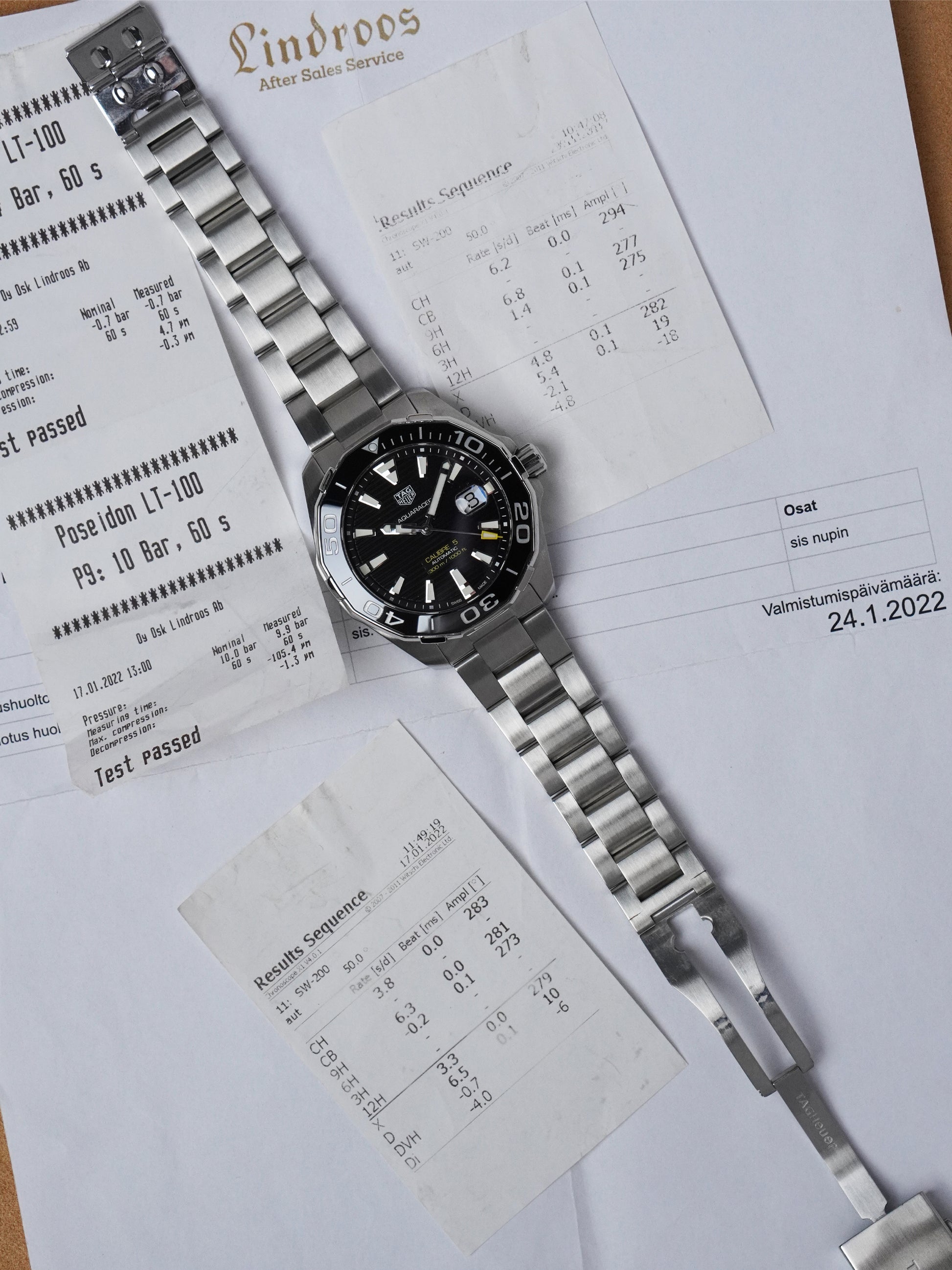 Included are the original outer box, original presentation box, service report dated 24.01.2022, pressure test print, user manual, International Guarantee Card dated 15.05.2017, as well as the original TAG Heuer tag with watch details and the original tag with stickers. The stainless-steel bracelet is complete, suitable for a 21 cm wrist, with a diver’s extension up to 22 cm.