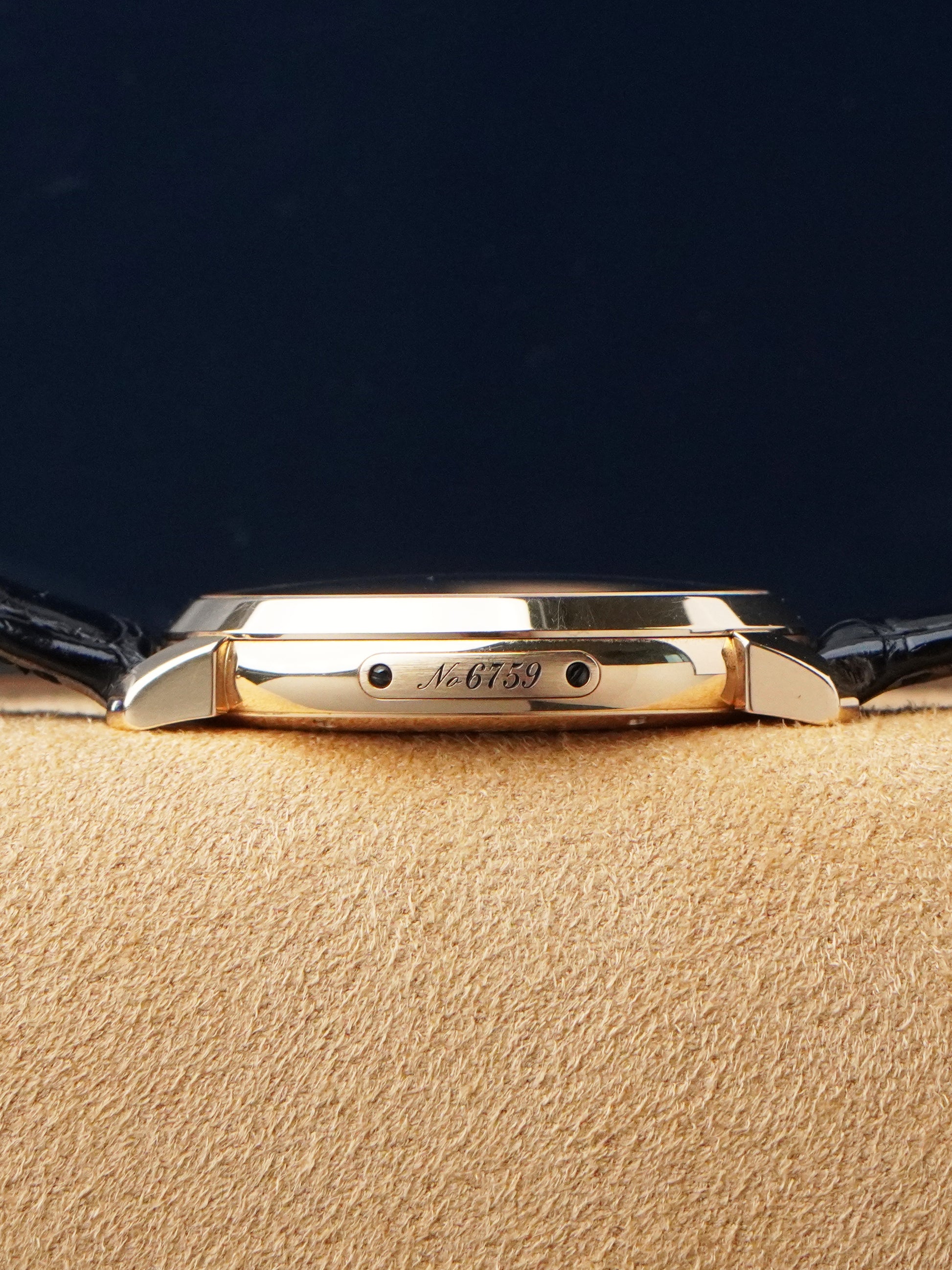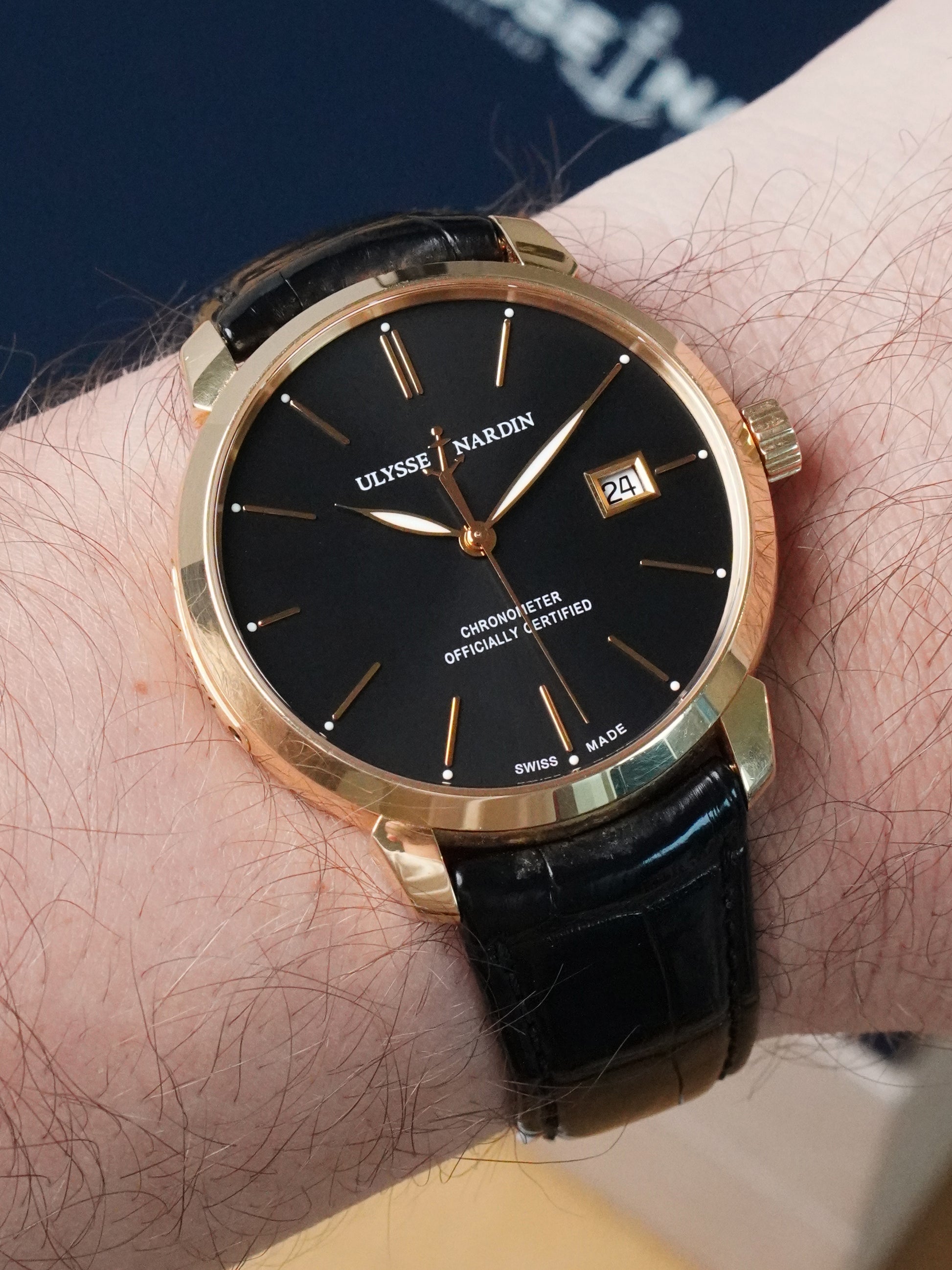 The watch is fitted with its original leather strap, suitable for a 20 cm wrist, paired with a matching Ulysse Nardin buckle. With a water resistance of 50 m, slim profile, and luxurious rose-gold case, it offers an ideal balance between modern presence and classic dress-watch refinement.