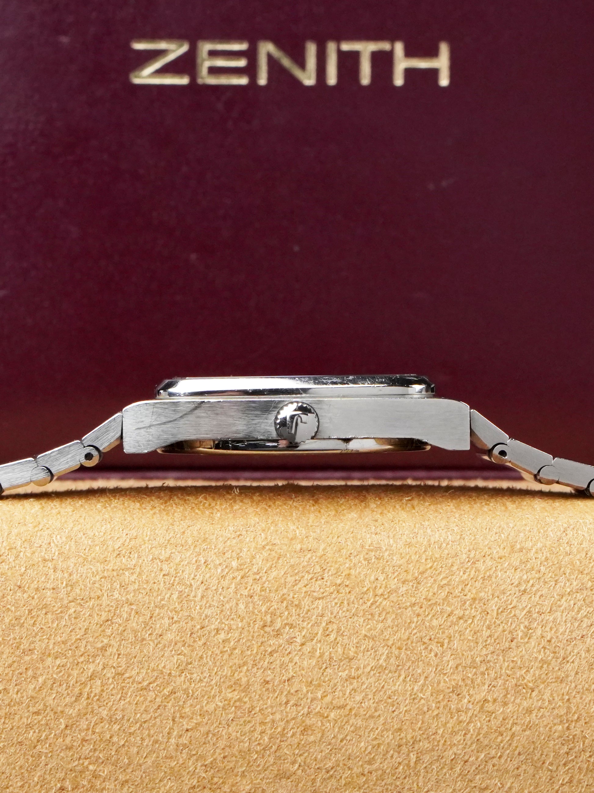 This watch is in very good condition, and has been fully serviced by our Omega Certified in-house watchmaker, including a new battery. It comes with its original Zenith box, a rare bonus for a vintage timepiece of this age. The integrated stainless steel bracelet fits wrists up to 17.5 cm.